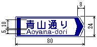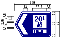 (ア) 案内標識 縁は、道路に設置するもので、「待避所」、「駐車場」及び「まわり道(20-B)」を表示するものについては9ミリメートル、「総重量限度緩和指定道路(118の3-A・B)」及び「高さ限度緩和指定道路(118の4-A・B)」を表示するものについては16ミリメートル、「登坂車線」を表示するものについては10ミリメートル、「道路の通称名」を表示するものについては8ミリメートル、その他のものについては日本字の大きさの20分の1以上の太さとし、縁線及び区分線は、日本字の大きさの20分の1以上の太さとする。