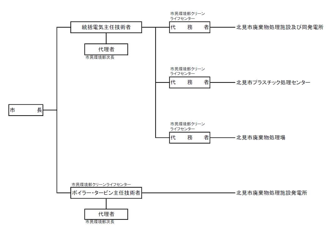 第6条 電気工作物の保安業務の執行は、施設管理者の命を受け、統括電気主任技術者が、火力設備(内燃力を原動力とするもの及び電気的設備に係るものを除く。)を除く電気工作物の保安業務の統括管理及び監督を行うものとし、ボイラー・タービン主任技術者が火力設備(内燃力を原動力とするもの及び電気的備に係るものを除く。)の保安業務の管理及び監督を行うものとする。