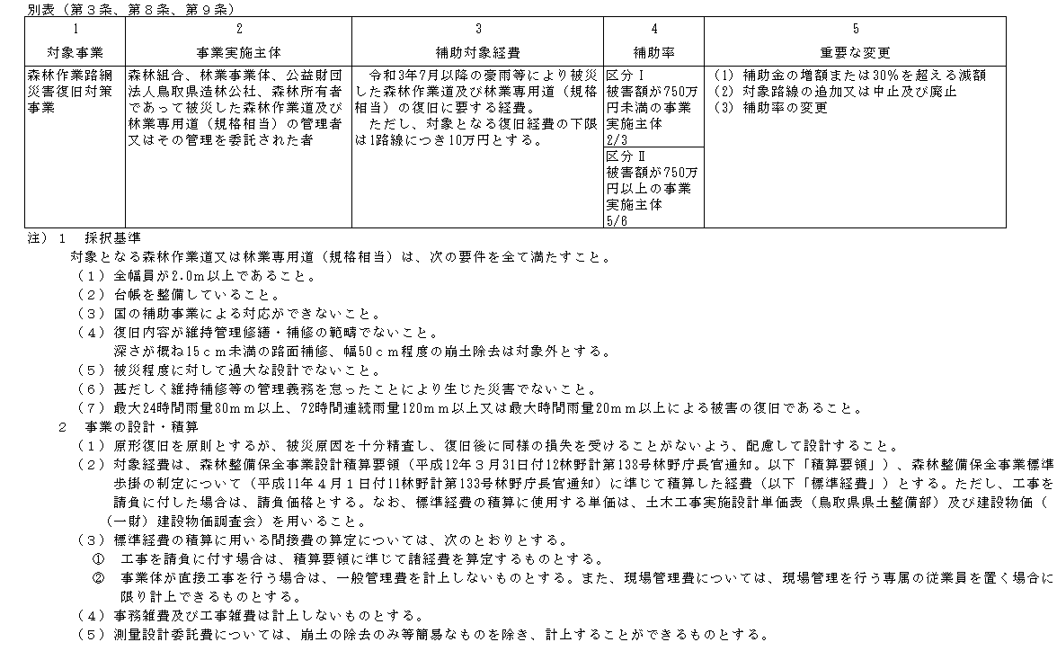第2条 本補助金は、令和3年7月以降の豪雨等により、路面流出等の被害を受けた森林作業道及び林業専用道(規格相当)を速やかに復旧することにより、計画的な森林施業と安定的な原木生産の実施、林地及び周辺環境の保全を図ることを目的として交付する。